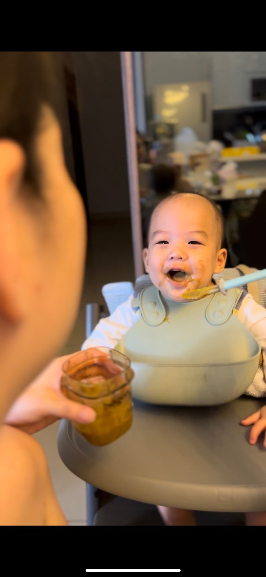 十個月可以跟大人一樣吃三餐,食物的部分大人吃什麼就跟著吃,不過我會不加鹽跟加少許的油另外幫寶寶煮或炒一份,食材是跟大人吃一樣的,目前都是自己煮覺得這樣比較健康