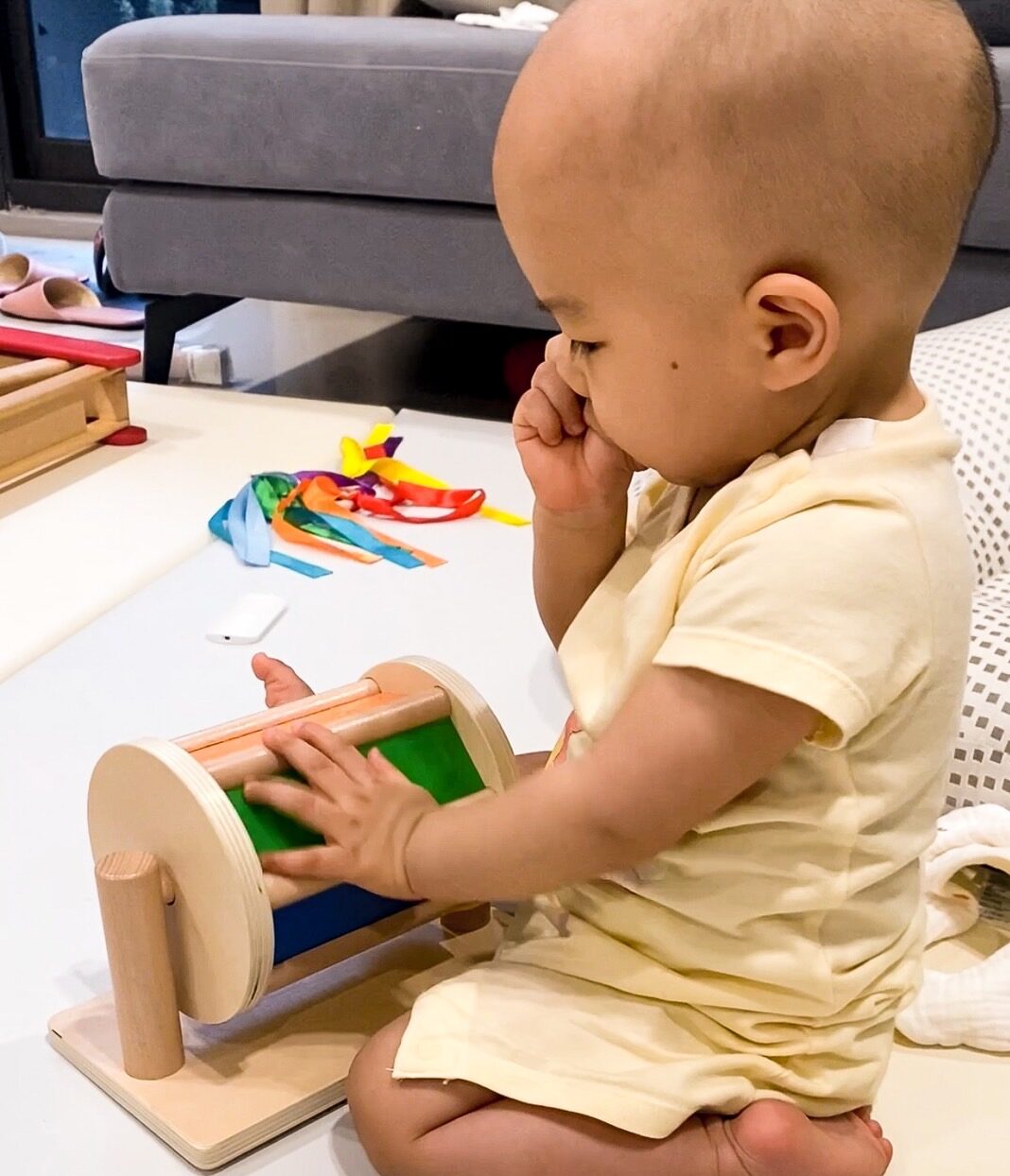 只要旋轉就可以聽到裡面的木球發出清脆的聲音,不管是趴著還是坐著都可以玩,只要手可以去拍打讓玩具旋轉,拍打鼓面時能加強手臂及手腕的運用,藉由鼓面不同的顏色可以促進視覺追蹤發展